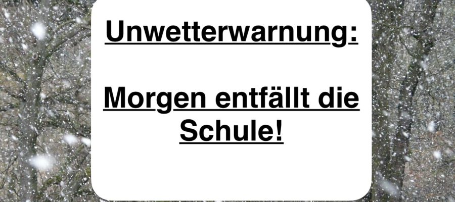 Sehr geehrte Eltern, das Schulministerium hat für Morgen angeordnet, dass kein Unterricht in der Schule stattfindet. Dies geschieht aufgrund der Unwetterwarnung für morgen. Über IServ werden die Kolleginnen Ihnen mitteilen,